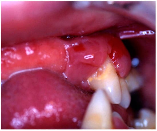 Notably, 55% to 80% of cases of disseminated LCH may manifest lesions in the head and neck, especially of the skull (mostly of the temporal bone), lymph nodes, skin and orbit, while only 7–10% have oral lesions (mostly jaw lesions); moreover, primary manifestations in the oral cavity are rare [,,,,,]. Clinically, localized or multiple gingival swellings with edema/inflammation or ulceration (rarely), periodontal involvement with teeth mobility/dislocation, often associated to destroying bone lesions (especially of the posterior mandible) with the conventional appearance of “floating teeth” or “floating in air” teeth on radiograms, are common primary findings in not yet diagnosed cases [,,,]. Even less frequent is the primary onset of a single bone lesion (especially in the maxilla) with periosteal reaction, punch-out radiolucent appearance, absence of cortical bone or diffuse periodontal involvement, mimicking on radiograms aggressive and diffuse periodontal disease, as well as mucosal infiltration (almost exclusively of the palate) with slight proliferation, erythema and strawberry appearance [,,,,].