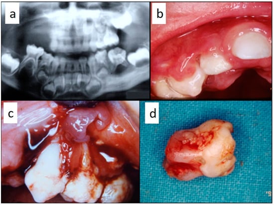 (a–d): Primary periodontal manifestations of LCH in a 5-year-old male: multiple osteolytic lesions in the mandible and in the maxilla (a) associated with gingival overgrowth and inflammation (b) and to painful ulceration of the gingiva with radicular exposure, bone loss (c) and tooth mobility with incomplete radicular formation due to the dental follicle involvement (d).