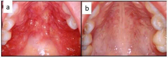 (a,b): Diffuse infiltration of the palatal mucosa with strawberry appearance as the first manifestation of LCH (a); complete regression after medical therapy (b).
