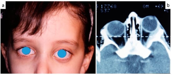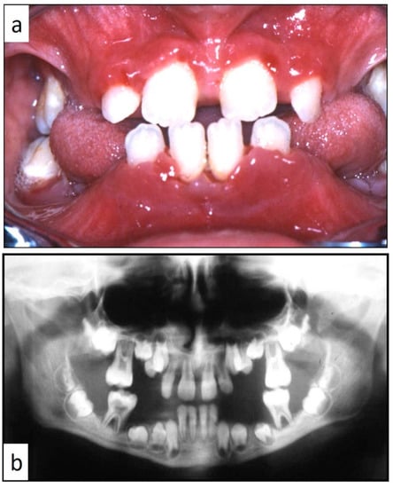 Nine patients were affected by single eosinophilic granuloma of the mandible and two of the maxilla (0–10 A; 10–18 C). Inflamed, hyperplastic, painful and often ulcerated gingival lesions were common findings in 22 cases (0–10 A; 10–18 B) (Figure 1). They were associated with deciduous teeth mobility and/or dislocation with gingival probing and periodontal bone loss in 18 cases, and to premature teeth loss with dislocation of the permanent teeth follicles and bone lesions (single or multiple) in nine cases (0–10 B; 10–18 A) (Figure 2a–d). Focal gingival swelling (often with superficial ulceration) occurred in patients with single lesion of the jaws (five in the maxilla and three in the mandible), all appearing as radiolucency with well-defined borders but, however, with rapid bone erosion (0–10 A; 10–18 C). Single lesions of the palatal mucosa were detected as the first sign in six patients (0–10 A; 10–18 B), generally appearing as reddish or strawberry gingivitis with periodontal involvement and/or complete diffusion to the palate (0–10 C; 10–18 B) (Figure 3a,b). Nine patients showed diffuse lesion of the mandible with a progressive resorption of the alveolar bone with the characteristic “floating teeth” appearance (0–10 B; 10–18 A); in six cases, localized lesions of the maxilla were synchronously detectable (0–10 C; 10–18 B) (Figure 4a,b). In addition, patients with periodontal involvement had in common a delayed diagnosis of several months as they received treatments for gingival/periodontal diseases but were unresponsive to each one. The resorption of dental roots has never been observed on either deciduous or permanent teeth. Paresthesia, due to compression of the inferior alveolar nerve, was observed in only three cases, while in six instances a pathological fracture of the mandible occurred (0–10 A; 10–18 C) (Figure 5a–c), both resulting in expansion of an osteolytic lesion. Submental, submandibular and lateral-cervical lymph nodes involvement was associated with oral lesions in 12 cases (0–10 B; 10–18 B). Adjunctive radiological examination revealed lesions of the skull in 14 patients and, respectively, two of the parietal bone (Figure 6a), two of the temporal bone, one of the zygomatic bone, and three of the orbit (0–10 B; 10–18 C). Otitis (media or externa) was referred or detected in four instances, cutaneous rush in nine (0–10 B; 10–18 C) (Figure 6b), exophthalmia in two (Figure 7a,b), while data about the contextual presence or subsequent onset of insipidus diabetes were available only in eight cases (0–10 B; 10–18 C).