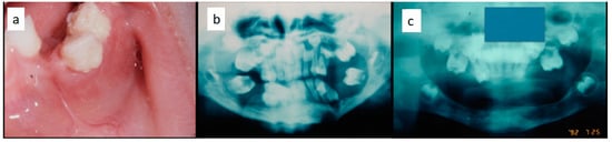(a–c): Diffuse periodontal lesions in the mandible in a 5 year-old female patient causing teeth mobility with pathological fracture and dislocation on the left side (a,b); panoramic radiograph after medical and functional treatment (c).