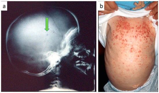 (a,b): Skull radiogram showing a small osteolytic lesion of the parietal bone (a); cutaneous rush occurring in children affected by LCH.