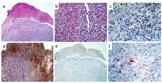 In all cases, histopathological analysis of surgical samples from oral lesions revealed the presence of characteristic histiocyte-like cells that, in some fields, presented multi-lobulated nuclei and prominent nucleoli (Figure 8a,b). This predominant cell population was intermixed with a variable number of eosinophils and neutrophils and with chronic inflammatory infiltrate (Figure 8c); hemorrhagic exudate was occasionally observed. As for immunohistochemistry, all neoplasms stained positively for CD1a (Figure 8d), CD207 (Langerin) and S100 (Figure 8e); inconstant was the stain for CD34 and CD68 (approximately 60%) (Figure 8f).