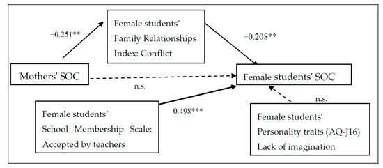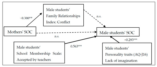 For male students, the mothers’ SOC significantly affected children’s conflicting feelings about their family (r = −0.300, p < 0.010) but did not affect their SOC. Acceptance by teachers (r = 0.563, p < 0.001) had a positive impact on students’ SOC. On the other hand, lack of imagination skills as measured by the AQ-J-16 had a negative effect on students’ SOC (r = −0.293, p < 0.001). For female students, the mothers’ SOC affected children’s SOC (r = −0.208, p < 0.010) through the family conflict that the child felt (r = −0.351, p < 0.010). On the other hand, unlike the male students, the lack of imagination did not affect females’ SOC. Just as in male students, acceptance by teachers had a positive influence on the females’ SOC (r = 0.498, p < 0.001). In addition, the cohesiveness and expression of the family relationships in students and mothers, student acceptance and sense of belonging to school, AQ-J-16 communication skills, attention switching, and so forth, were examined, but a good model fit was not obtained.