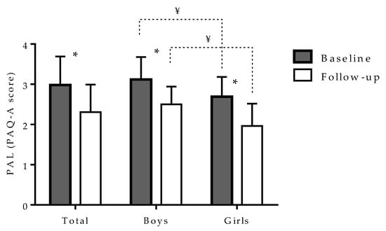 The PAL decreased significantly from baseline to the follow-up testing period in the sample as a whole (from 2.98 ± 0.71 to 2.31 ± 0.68; t-test: 11.88, p < 0.001), as well as when observed separately among girls (2.69 ± 0.49 to 1.95 ± 0.56; t-test: 8.88, p < 0.001) and boys (from 3.12 ± 0.56 to 2.50 ± 0.44; t-test: 10.01, p < 0.01). Boys had higher level of PAL than girls at baseline (t-test: 12.55, p < 0.001) and at the follow-up measurement period (t-test: 11.99, p < 0.001) (Figure 2).