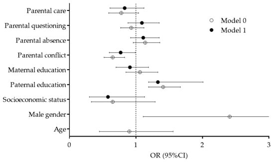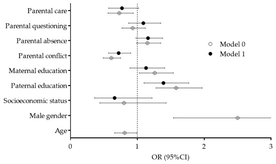 Correlates of baseline-PAL are presented in Figure 3. Since crude logistic regression provided evidence of significant influences of gender and age on baseline-PAL, with a higher likelihood of sufficient PAL among boys (OR: 2.50, 95%CI: 1.54–3.03) and lower likelihood of sufficient PAL among younger participants (OR: 0.81, 95%CI: 0.66–0.99), we briefly present only the results of logistic regression model controlled for gender and participants’ age as covariates (Model 1). Paternal education was associated with sufficient baseline-PAL (OR: 1.40, 95%CI: 1.10–1.77), while a lower likelihood of a sufficient level of PAL at baseline was found for adolescents who reported a higher level of conflict with parents/family members (OR: 0.72, 95%CI: 0.57–0.90).