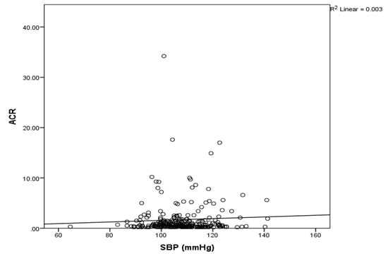 Correlation between systolic blood pressure (SBP) and albumin to creatinine ratio (ACR). There was a positive linear relationship with R2 =0.003.