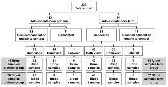 Fifty-one former preterm-born adolescents and 82 term-born controls consented to either both or one of the study components. Forty-six urine samples and 26 blood samples were obtained from study participants in the preterm group, and 65 urine samples and 52 blood samples were obtained from the term group (Figure 1). The adolescents who did not consent to study participation or who could not be contacted for recruitment had similar BW and GA values at birth to the study participants. There were minor variable differences between the subgroups within the preterm- and term-born participants who did or did not provide either urine or blood samples or both (Table S2 in Supplementary Materials).