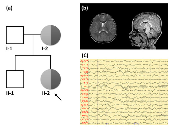 A 20 month-old girl (II-2 in Figure 1a) was referred to the department of pediatric neurology after four episodes of FS. Her mother witnessed generalized tonic–clonic seizures that lasted under 5 min with a fever of 38 °C–40 °C. By the time the patient was transported to the emergency department, she had fully recovered. At 21 months of age, she came to our emergency department after generalized tonic–clonic seizure that lasted for 20 min without fever. The seizure had ceased and her mental state had recovered when she arrived at the emergency room. Two hours later, her seizure recurred and the seizure was terminated after an injection of lorazepam. In brain magnetic resonance images (MRI), no obvious abnormalities for her age including an appropriate myelination pattern were observed (Figure 1b). The interictal electroencephalogram (EEG) was normal (Figure 1c). The results of metabolic laboratory testing including plasma amino acid, thyroid function tests, lactate/pyruvate, urine organic acid, and blood gases were normal. We observed her without anti-seizure medication at the outpatient clinic. After that, she showed two more simple FSs at the age of 24 months and 35 months. At 36 months old, she was admitted because of a prolonged FS. The seizure apparently lasted for 25 min and ceased after the administration of intravenous lorazepam in the emergency department. Later, a fever of 39.5 °C was noted, and adenoviral infection was diagnosed. Her growth and developmental milestones were proper for her age. Her height (92 cm), weight (13 kg), and head circumstance (47 cm) were 50 percentiles, respectively. Febrile and afebrile seizures had not occurred after the age of 3 and her development was appropriate for her age. Except for a history of seizures in her mother (I-2 in Figure 1a), there was no family history of developmental delay, intellectual disability, and epilepsy. The 35 year-old proband’s mother experienced five episodes of simple FS and two episodes of unprovoked seizures before 5 years old. The mother’s computed tomography scan and EEG were normal and she has remained seizure free since 5 years old without anti-seizure medication. The mother’s development was completely normal and she completed her college education.