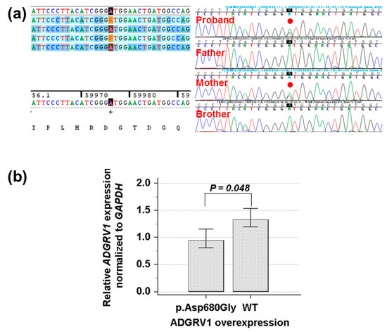 By estimating the sequence quality along all sequences, 18.9 million reads 150 bp in read length were produced from the patient sample. The % bases above average 30× were achieved for 99.2% of the target region and the mean read depth (×) was 170 bp. Targeted exome sequencing identified a heterozygous c.2039A>G of the ADGRV1 gene leading to a codon change of aspartic acid to glycine at position 680 (NM_032119.3: c.2039A>G, p.Asp680Gly; rs547076322) had not been reported previously to be related to afebrile and/or febrile seizures in the proband. To confirm the mutation segregated with affected members, Sanger sequencing was conducted and revealed that this mutation as a heterozygous state was present in the proband and her mother, respectively (Figure 2a). Cross-species sequence comparisons (phastCons, SiPhy, and GERP) of amino acid sequences of ADGRV1 protein revealed that this mutated site was highly conserved in vertebrates (phastCons 0.994 > cut-off of 0.8, SiPhy 16.285 > 12.17, and GERP 5.87 > 4.4) [27]. The exome database of gnomAD showed a rare allele frequency of 0.00002827. In addition, quantitative RT-PCR revealed that the expression of ADGRV1 mutant was weaker than that of the wild type (p = 0.048) (Figure 2b). Particularly, (likely) pathogenic SCN1A mutations were not identified in this family.