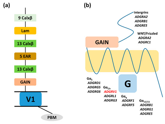 - McMillan, D.R.; Kayes Wandover, K.; Richardson, J.; White, P. Very large G protein-coupled receptor-1, the largest known cell surface protein, is highly expressed in the developing central nervous system. J. Biol. Chem. 2002, 277, 785–792. [Google Scholar] [CrossRef] [PubMed]