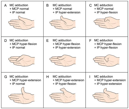 The House TIP classification has four types: type I, metacarpal (MC) adduction; type II, MC adduction and metacarpophalangeal (MCP) joint flexion; type III, MC adduction and MCP joint hyperextension; and type IV, MC adduction and MCP and interphalangeal (IP) joint flexion []. The type I pattern is subdivided according to the condition of the IP joint: neutral (type Ia); hyperextension (type Ib); and hyperflexion (Ic). Type II House TIP classification can be further subdivided into two groups: IP joint neutral (type IIa) or hyperextension (type IIb). The type IV pattern can be differentiated from type II by the presence of IP joint flexion. The dynamic TIP deformities were assessed while the children were grasping a large object (hand-sized ball) or a small object (bean-sized pellet) in a sitting position. The dynamic TIP pattern while holding an object was assessed at each joint as follows: (1) MC joint; adduction or not; (2) MCP joint; normal, hyperflexion, or hyperextension; and (3) IP joint; normal, hyperflexion, or hyperextension (Figure 1). In addition, the presence of thumb MCP joint instability with hyperextensible laxity was also assessed.