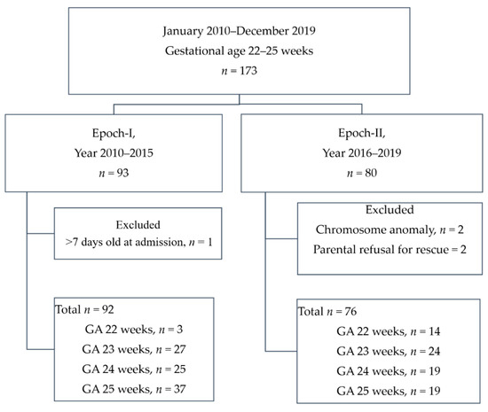This study was approved by the Institutional Review Board of National Cheng Kung University Hospital ER-98-135. The study aimed to identify the differences in the survival of resuscitated periviable infants between the two periods: before and after the implementation of NRP 2015. We retrospectively conducted applied comparative cohort research for two epochs. All periviable infants admitted to our unit from January 2010 until December 2019 were enrolled. The first epoch (Epoch-I) included years 2010–2015, and the second epoch (Epoch-II) included years 2016–2019.