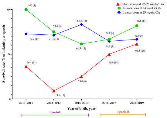 In recent years, researchers have become increasingly interested in the care of periviable infants [1,2,3]. The care of periviable infants continues to challenge state-of-the-art medicine. Periviable birth is defined as delivery happening from 200/7 to 256/7 weeks gestational age (wGA) [4,5,6]. In the past two decades, there have been reports of increased rates of survival of periviable infants born at 22–25 wGA from single centers or large cohorts in Taiwan, Japan, USA, France, Germany, and Australia [7,8,9,10,11,12,13,14]. However, the reported survival rate of periviable infants varied between reports (49.7–86.2%) [9,11,15]. In particular, in infants born at 22–23 wGA, the reported survival rate is from 8% to 70% for infants born at 22 wGA [9,15] and from 25% to 75.4% for infants born at 23 wGA [13,15].