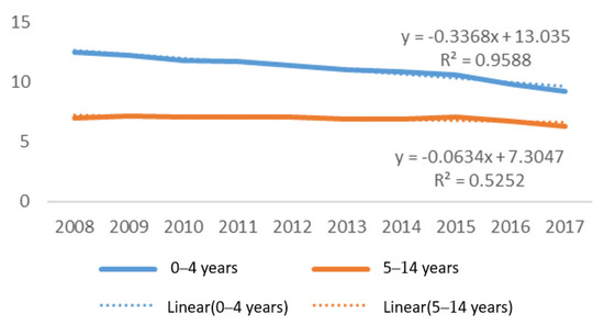 Rates of child drowning for both age groups declined over the study period, with drowning among 0–4 year olds declining at a faster pace (y = −0.3368x + 13.035; R2 = 0.9588) than 0–14 year olds (y = −0.0634x + 7.3047; R2 = 0.5252) (Figure 4). Among 0–4 year olds, rates varied from a high of 12.67 per 100,000 children to a current low of 9.30 per 100,000 population in 2017; whereas rates for 5–14 year olds varied from a high of 7.15 per 100,000 population to a low of 6.29.