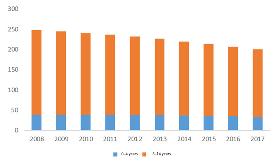 Number of drowning deaths by year and age group, children 0–14 years, Philippines, 2008–2017.