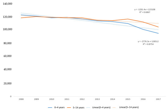 For the total burden of drowning among children aged 0–14 years in the Philippines, there were a total of 2,292,471.0 DALYs recorded across the study period. The DALYs burden is evenly split between the age groups, with 5–14 year olds accounting for 50.6% of the total burden. When examining trends over time, the unintentional drowning-related DALY burden declined for both age groups, with a more significant decline over the study period in the 0–4 years age group (y = −2776.3x + 128512; R2 = 0.8754) (Figure 7).