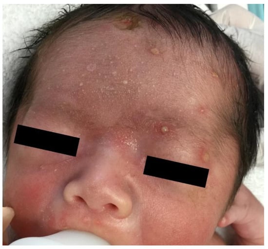 To diagnose noninfectious pustular diseases, infectious pustular diseases must be ruled out. Infectious pustular diseases include bullous impetigo, congenital cutaneous candidiasis, herpes simplex virus infection, varicella, etc. []. These diseases are differentiated based on a combination of systemic symptoms, bacterial and fungal cultures, direct microscopy, Tzanck test, and PCR analyses.