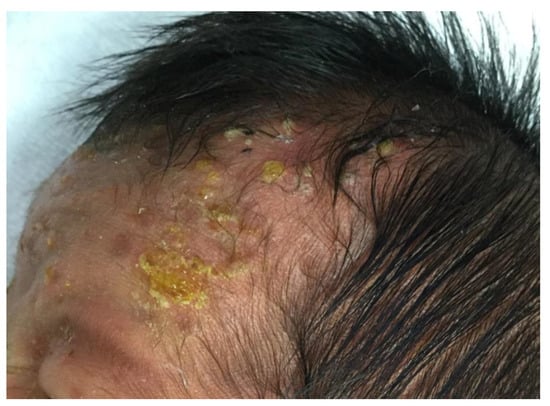 At birth, the patient developed multiple pustules measuring 1–5 mm and a few erosions with erythema on his scalp and forehead. Some pustules were crusted.
