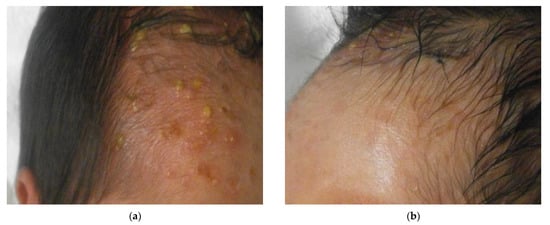 EPF in infancy is a rare disease first reported by Lucky et al. in 1984 []. EPF is a disease that causes pruritic erythema, blisters, and pustules centered on hair follicles without systemic symptoms. The predominant site of EPF in infancy is the scalp, although seborrheic areas of the face, trunk, and limbs may also be affected. The skin manifestations of EPF are characterized by pustules measuring 1–3 mm accompanied by erythema, leading to the formation of plaques and pigmented spots. Unlike adult EPF, the lesions of EPF in infancy exhibit secondary crusting [,]. These eruptions follow a cyclical course from three months to five years []. The best way to quickly diagnose EPF without assessment of the clinical course is to perform a Tzanck smear of a pustule or skin biopsy. The pustules in EPF contain large numbers of eosinophils and are accompanied by dermal infiltration of eosinophil-dominated inflammatory cells around the hair follicles. If the lesions do not show folliculitis on biopsy, the condition is preferentially referred to as neonatal eosinophilic pustulosis (NEP) []. As EPF and NEP present with similar symptoms and a similar clinical course, it may not be necessary to distinguish between EPF and NEP. Topical corticosteroids were reported previously to show beneficial effects in both EPF and NEP [].