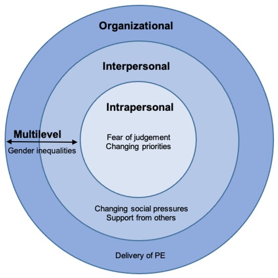 Key themes were identified at the intrapersonal (fear of judgement and changing priorities), interpersonal (changing social pressures and support from others) and organizational level (delivery of PE). In addition, one factor was identified as a cross-level theme (gender inequality). Subthemes are identified below in italics. A visual overview of how the main themes map onto the socioecological model can be seen in Figure 1. Table 2 provides an overview of themes and subthemes with illustrative quotes.