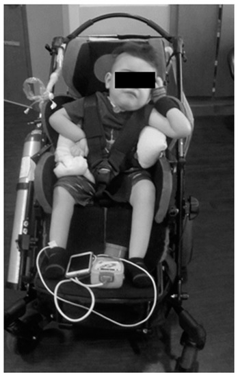 Patient’s initial presentation to clinical program. The patient relies on lateral supports of stroller and additional padding to assist with upright maintenance of trunk; however, he still demonstrates left lateral trunk lean and resting head on head support. He demonstrates preferential posturing with bilateral upper extremities.