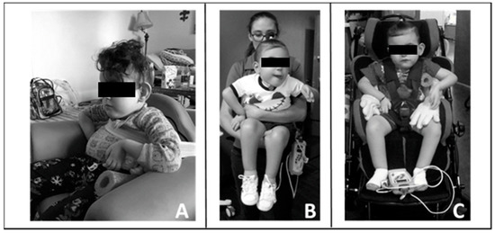 Carry-over of training principles into home and community. (A). Modified seat to provide patient with pelvic, lateral, and trunk support. (B). Modified carrying position with patient upright allowing for engagement, visual tracking, and head control. (C). Modified stroller by bringing patient more upright and added lateral supports to achieve mid-line posture and allow visual engagement and participation.