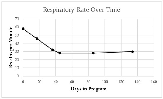 The patient’s resting respiratory rate as measured at both primary care and pulmonology office visits steadily declined over a 4-month period from 60 to 30 BPM (Figure 4 [17]).