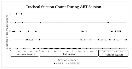 Number of tracheal suctions required during each ABT session 1–94 across seasons. AB-NMES initiated at session number 56. ABT= activity-based therapy, AB-LT = activity-based locomotor training. AB-NMES = activity-based neuromuscular electrical stimulation.