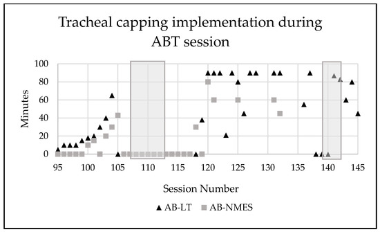 Number of minutes the patient’s tracheostomy was capped during activity-based therapy sessions. Grey shadow indicates a time period where patient was sick (cold, viral infection). AB-LT = activity-based locomotor training. AB-NMES = activity-based neuromuscular electrical stimulation.