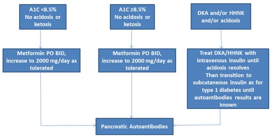 The ADA guidelines recommend the initiation of insulin in youth that present with ketosis/ketonuria/ketoacidosis/hyperosmolar hyperglycemic non-ketotic syndrome or those with A1C ≥ 8.5% [15,17,25] (Figure 2). In these patients, subcutaneous or intravenous insulin should be initiated initially for the correction of hyperglycemia and metabolic abnormalities. Subcutaneous insulin should be continued and metformin can be started once the acidosis has resolved.