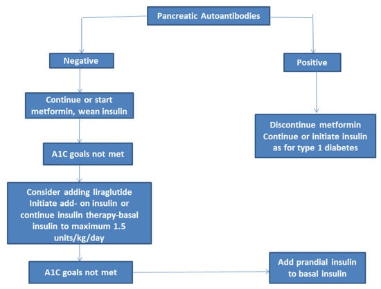 Multiple daily injections with prandial short-acting insulin should be recommended in youth on high doses of basal insulin (up to 1.5 units/kg/day). Pancreatic autoantibodies are helpful in the management of diabetes in youth. If autoantibodies are positive, insulin therapy should be continued or initiated, and metformin should be discontinued (Figure 2). If pancreatic autoantibodies are negative, metformin should be continued or started, and an attempt should be made to wean insulin guided by self-monitoring of blood glucose (SMBG) values. Most (90%) of the youth in the TODAY study with recent onset T2DM were able to be weaned off insulin and treated with metformin alone [31,61]. There is need for data on use of continuous glucose monitoring (CGM) in youth with T2DM that are on intensive insulin therapy [62]. In adults with T2DM, the use of CGM was associated with an improvement in A1C at 24 weeks compared to the control group [63]. Adverse effects related to insulin use include weight gain and hypoglycemia. Hypoglycemia is rare in youth with T2DM due to insulin resistance [18]. Insulin regimens should be carefully tailored to lifestyle and individual needs.