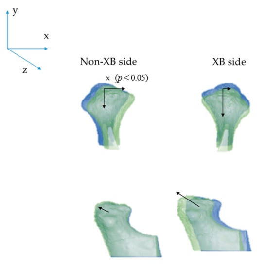 Condylar changes (T1–T0). T0: blue; T1: green. Significant changes were found only for the x-axis between the Non-XB side and XB side.