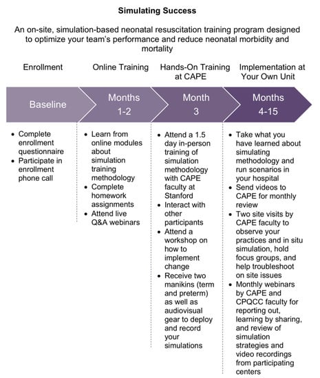 Simulating Success engaged hospitals over 15 month long periods that included three months of preparatory training followed by 12 months of implementation (Figure 1). Simulating Success was offered by CPQCC in partnership with the Center for Pediatric and Perinatal Education (CAPE) at Stanford University. Preparatory training consisted of an online didactic program followed by a 1.5 day, face-to-face training program at CAPE in the core principles of developing and conducting simulation-based training. The online didactic program was made available to an unlimited number of staff members at each site. Face-to-face training was attended by a maximum of three staff members from each site (referred to as the ‘multidisciplinary champion team’ for the remainder of this manuscript). Implementation at each site entailed ongoing in situ simulations followed by debriefings and monthly online check-ins with CAPE faculty, in addition to two site visits, for continued feedback and support.