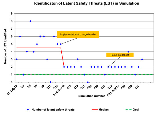 LSTs identified during CHOC simulations over time. Of note, there was a significant shift in the median (>8 consecutive data points below the median) during PDSA cycle 2 towards the goal of ≤1.