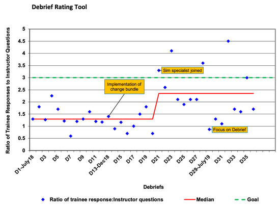 DART scoring revealed improvement over time towards the goal ratio of 3:1 [trainee responses: instructor questions + statements] (Figure 3). Of the 61 post-simulation surveys sent, 56 were completed; 90% of participants strongly agreed or agreed with the objectives of the program. These objectives were to provide a realistic simulated multidisciplinary team training experience in a constructive and psychologically safe learning environment and with ongoing feedback for improvement from participants. Notably, 89% of the participants believed the debriefing was constructive, 92% felt safe participating in the debrief and 90% wanted to experience more simulation sessions. In response to early qualitative feedback on sessions sometimes being overly long, subsequent sessions were adjusted by having a set time for debriefing.
