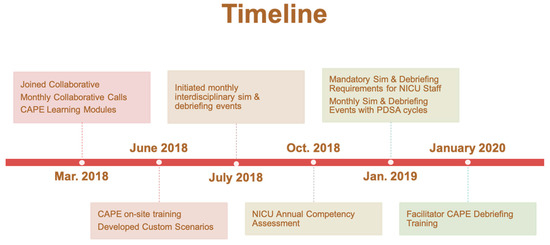 The multidisciplinary champion team at SMB was comprised of a neonatologist, clinical nurse specialist, a NICU supervisor and respiratory therapist. A total of 15 HCPs completed the online video training. The team developed a variety of custom NICU scenarios based on actual code events that occurred in Labor and Delivery and in the NICU. Beginning in July 2018, the team began video recording of simulations and debriefings. A timeline of the progression of the project is depicted in Figure 4. Simulation and debriefing events were held monthly for both day shift and night shift. Neonatologists and neonatal nurse practitioners were encouraged to participate in at least one simulation. Initial survey results demonstrated overwhelmingly positive results from HCPs who participated in these simulation and debriefing events. Forty-two HCPs responded to the initial survey; nurses and respiratory therapists represented 85% of the respondents. These respondents had moderate level of experience in their specialty (14.0 years + 11.7). Results demonstrated that participants had increased confidence in communicating during an emergency, increased ability to function as an essential team member during a code, and increased ability to voice a concern during a critical situation (Appendix C).
