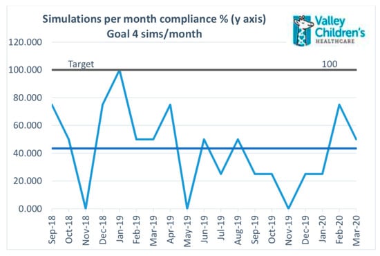 Increasing number of simulations. The global aim of increasing the number of simulations conducted in the Neonatal Service Line of Valley Children’s Healthcare was achieved although the monthly and quarterly targets for the number of simulations per month were not always met. The team has been able to significantly improve the quantity and quality of simulation training. The average compliance with the aim of four simulations per month was 40% (Figure 5).