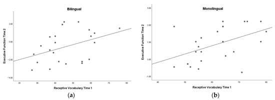Relation between receptive vocabulary at Time 1 and EF at Time 2 for bilinguals (a) and monolinguals (b).