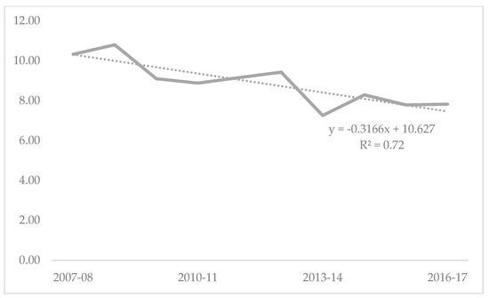 Across the study period, there were a total of 5153 children who died due to fatal injuries. As a rate per 100,000 population, injury-related mortality among 0–19-year-olds in Australia varied from a high of 10.80 in 2008-09 to a low of 7.26 in 2013–14. The temporal trend across the study period shows a decline (y = −0.3166x + 10.627; R