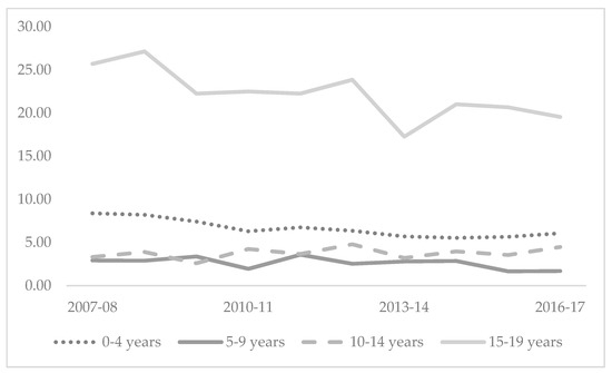 The highest rates of fatal injury were seen in the 15–19 years age group with an average rate across the study period of 22.23 per 100,000, compared with the lowest rate of 2.63 per 100,000 among the 5–9 years age group. Crude injury-fatality rates are declining among 15–19-year-olds, with stagnant rates among 0–4-year-olds and 5–9-year-olds, with a slight upturn in rates among 10–14-year-olds (