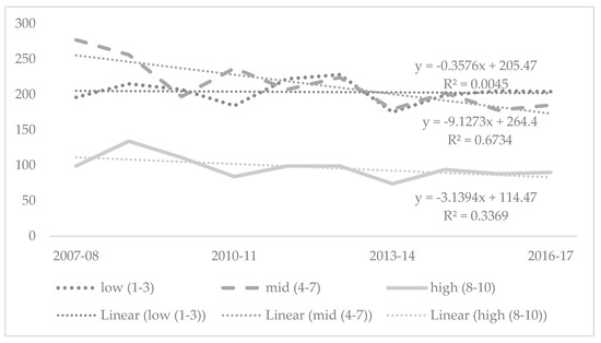 There was an annual average of 214 injury-related fatalities in areas classified as mid IRSAD decile, followed by 204 fatalities for low IRSAD decile residences. High IRSAD deciles recorded the lowest average, with 97 injury-related fatalities annually. Injury-related fatalities declined in all three IRSAD decile classifications across the study period, with the largest decrease occurring in the mid decile (y = −9.1273x + 264.4; R