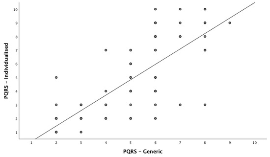 At post-intervention time period, however, the mean scores, 5.88 for PQRS-G and 6.2 for PQRS-I, are not significantly different from one another, likely due to high variance between the scores. Figure 2 shows that PQRS-G is higher at the low values, and lower at the high values, therefore more constrained in its distribution. PQRS-G never starts at 1 and never goes up past 8 or 9. PQRS-I has more spread from 1 to 10. Regression analysis between the two PQRS scoring systems showed R2 = 0.583 for all data available indicating moderate agreement and shown in Figure 2. When regression analysis was done per phase, baseline R2 was 0.458 for baseline phase and R2 = 0.525 for scores post-intervention. This indicates that, at baseline, the extend of the variance of one tool does not explain the variance of the other tool. For post-intervention this variance is moderate.