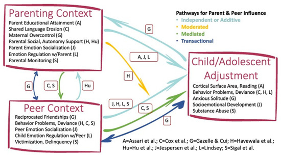 As can be seen in Figure 1, the specific parent and peer context variables assessed or discussed in the papers found in this Special Issue were a balance of positive and negative constructs, whereas child and adolescent behavior/adjustment variables tended to focus on different adjustment difficulties, such as externalizing and internalizing problems. For the most part, the parent/peer constructs examined (e.g., parental monitoring and peer victimization) are social-emotional variables that have been studied in the past, consistent with the constructs highlighted in Ladd and Parke’s review [9]. One exception was Assari et al.’s paper [1] that focuses on cortical development, representing an emergent trend in developmental and family science to examine the neurological correlates of children and adolescent relationships [10]. Although the peer context is not examined in Assari et al.’s study [1], the conceptual model guiding the authors’ thought—that children’s brains and hence reading development are impaired by the consequences of parents’ low levels of education—has clear implications for children’s adjustment in the peer group, given the empirical links among poor brain development, executive function, academic performance, and peer relation problems [11].
