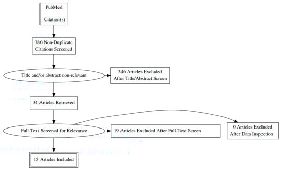 The PRISMA guidelines were used to structure this review. We performed a search in the PubMed database using the following algorithm: (((oscillometry) OR (oscillation)) OR (impedance)) AND (cystic fibrosis). The search retrieved 380 publications. The articles were eligible for review if they were written in English and included patients less than 18 years old. There was no chronological limitation. During the title and abstract screening, 346 articles were excluded as being not relevant to the subject, referring to patients older than 18 years, written in a non-English language, or being reviews. In addition, 19 more studies were excluded after reading the full texts. Finally, 15 articles were included in this systematic review. The literature search process is summarized in the form of a PRISMA diagram in Figure 1.