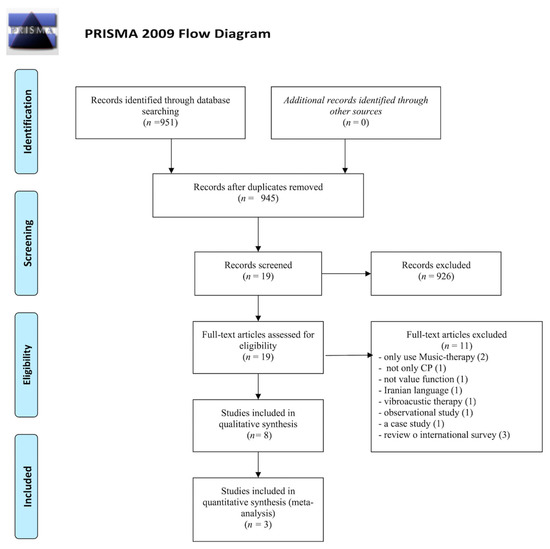 Eligibility criteria were based on the PICOS framework [27] as follows: Participants (people with PC, without age limit, who were able to follow verbal instructions and cooperate during the study, with no hearing loss), Intervention (any treatment intervention that uses MT in combination with PT), Comparison (intervention only with physiotherapy, only with music therapy, or no treatment), and Outcome (motor function: understood as the ability to plan and carry out voluntary movements [35]).