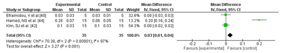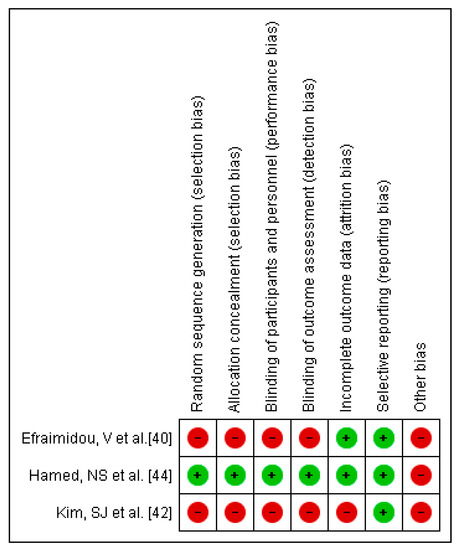 The sensitivity of the meta-analysis indicates that there is no statistically significant change if we eliminate Efraimidou [40] and Kim´s studies [42]. That is, the results of the meta-analysis still support the control group. However, when the Hamed´s study [44] is removed, there are no statistically significant results for either group.