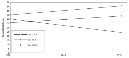 As shown in Figure 1, Class 1 was termed “high-increase class,” that had an average initial social skills score of 45.30 (p 0.05) and showed a relatively modest increase compared to the Class 2 (slope = 5.37, p 0.05). Class 2 was named “decrease class,” as members began with an average social skills score of 40.48, that was significantly different from zero (p 0.05), and showed total decrease across the entire time period (slope = −8.04, p 0.05). Class 3 was named “moderate-increase class,” that had an average initial socials skill score of 36.07 (p 0.05) and subsequently increased (slope = 4.01, p 0.05).