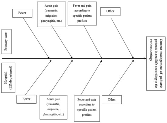 We analyzed three clinical scenarios: fever, acute mild–moderate pain (trauma, headache, otitis, pharyngitis, etc.), and fever and mild–moderate pain in specific patient profiles (dehydration, comorbidities, etc.). Analysis of the three clinical scenarios was divided according to three healthcare settings: primary care (territory), EDs, and (pediatric) hospital departments.