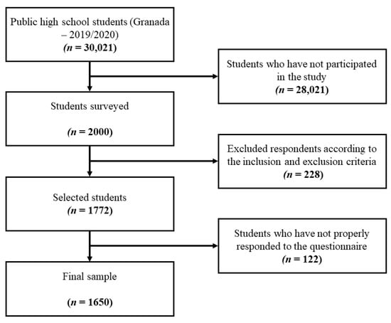 The present study was nonexperimental, quantitative, descriptive–exploratory, cross-sectional and ex post facto in nature. Measurements were taken from a single group. The study population of the present sample constituted all secondary school students enrolled at state-funded institutions in the province of Granada during the 2019/2020 academic year. According to the Statistical and Cartographic Unit housed within the Ministry of Education and Sport of the Local Government of Andalusia (Spain) (2020), students enrolled in the aforementioned general course of education in the province of Granada totalled 53,198 overall. In line with the criteria established by Otzen [68], all adolescents who agreed to participate and met certain inclusion criteria were considered as part of the study population. Inclusion criteria were as follows: (a) be enrolled in state-funded secondary education during the 2019/2020 academic year; (b) be aged between 11 y and 20 y; (c) provide signed informed consent for the handling of data pertaining to minors, where relevant. Likewise, exclusion criteria were established with the aim of obtaining a reliable sample. These were as follows: (a) suffering from any type of pathology or condition that would impede the correct completion of the questionnaire; (b) returning incomplete questionnaires or responses that could create confusion (responses crossed or rubbed out).
